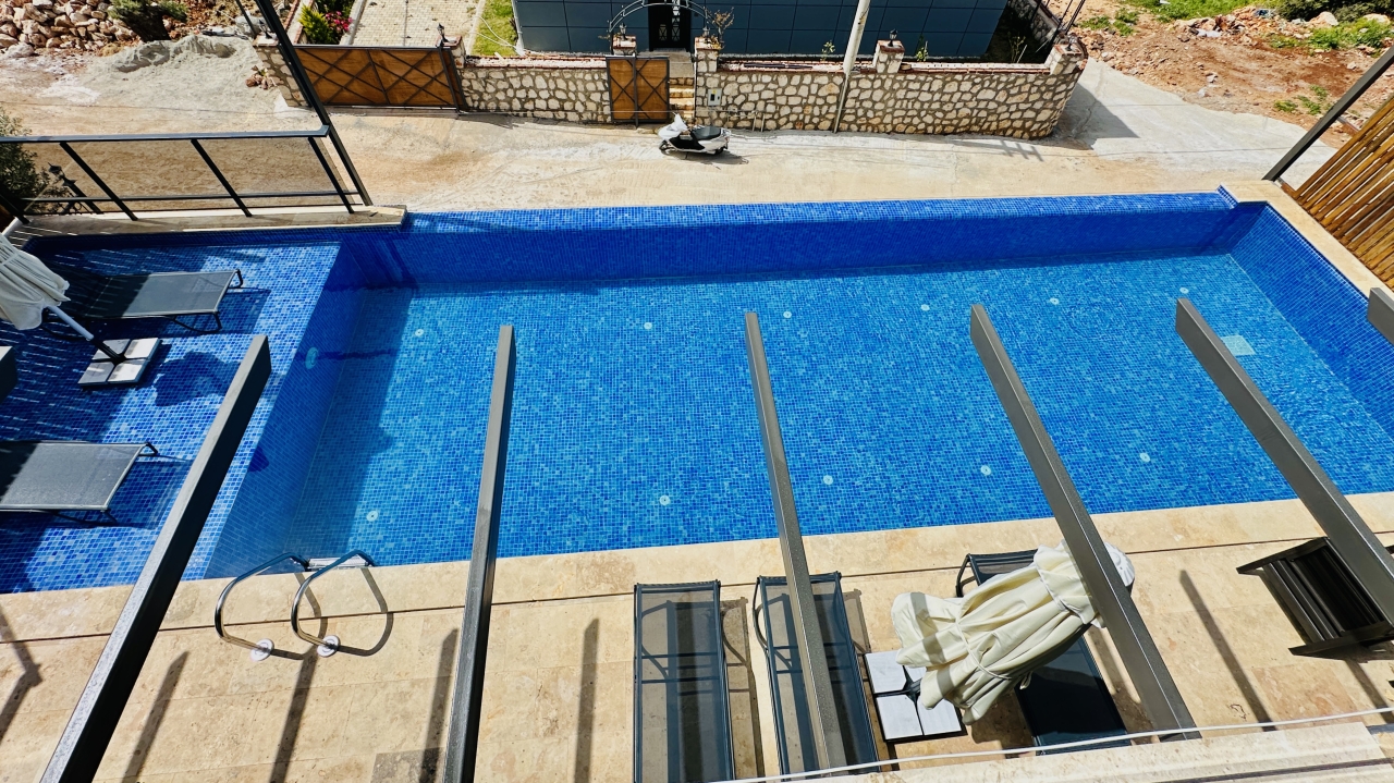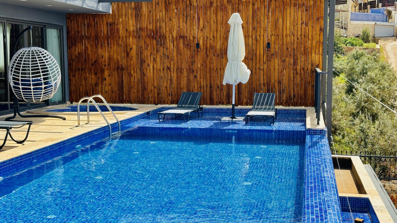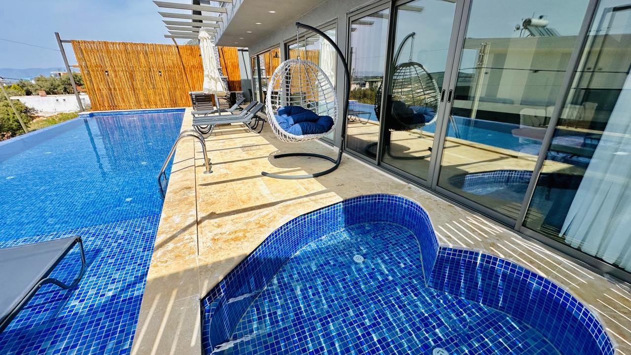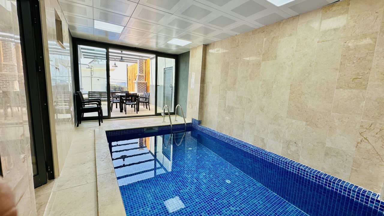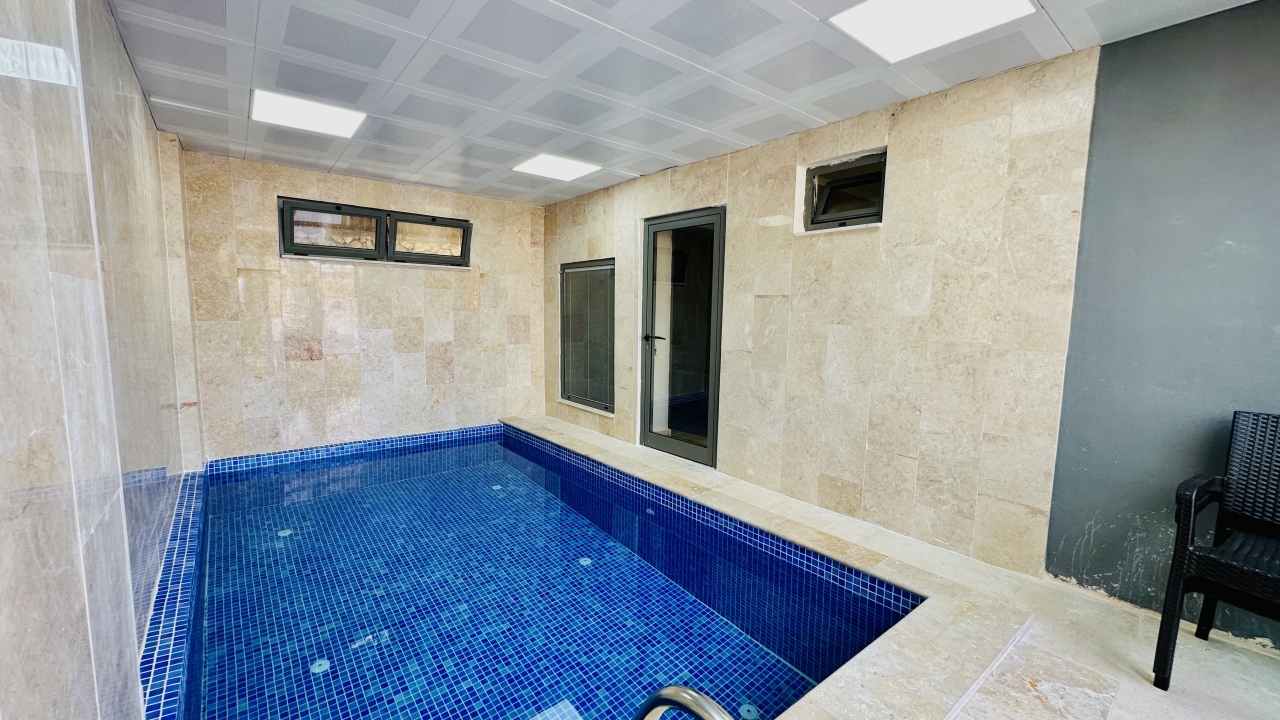 Villanın en dikkat çekici özellikleri arasında kapalı ısıtmalı havuz, sauna ve Türk hamamı yer alır. Zemin katta bulunan bu olanaklar, özellikle dört mevsim tatil yapmak isteyen misafirler için büyük avantaj sağlar. Havuz alanında ayrıca sığ havuz bölümü de bulunur ve bu alan çocuklu aileler için güvenli bir kullanım sunar. Geniş havuz terası, güneşlenme alanı ve manzaraya karşı keyifli vakit geçirebileceğiniz oturma alanlarıyla desteklenmiştir.