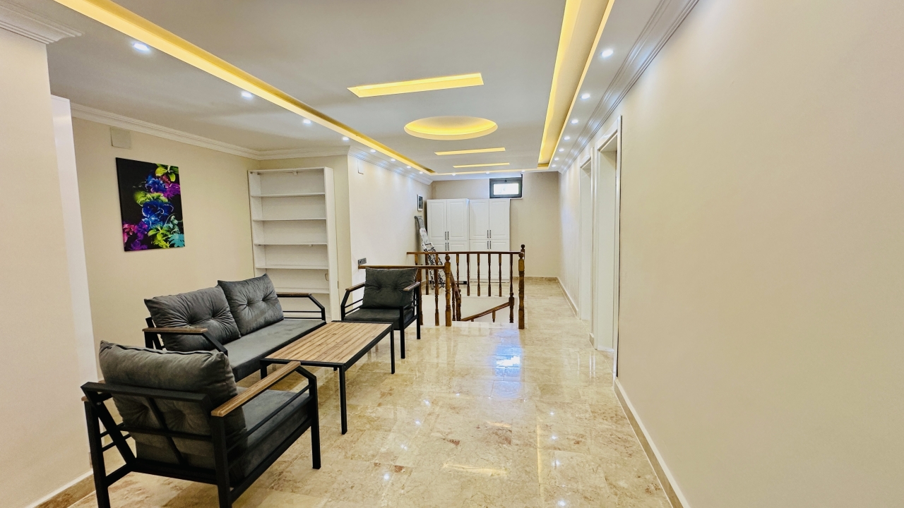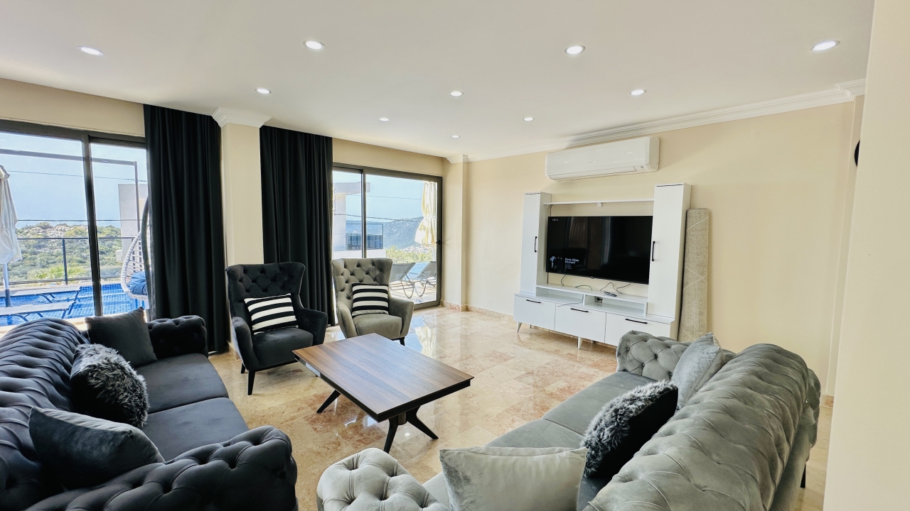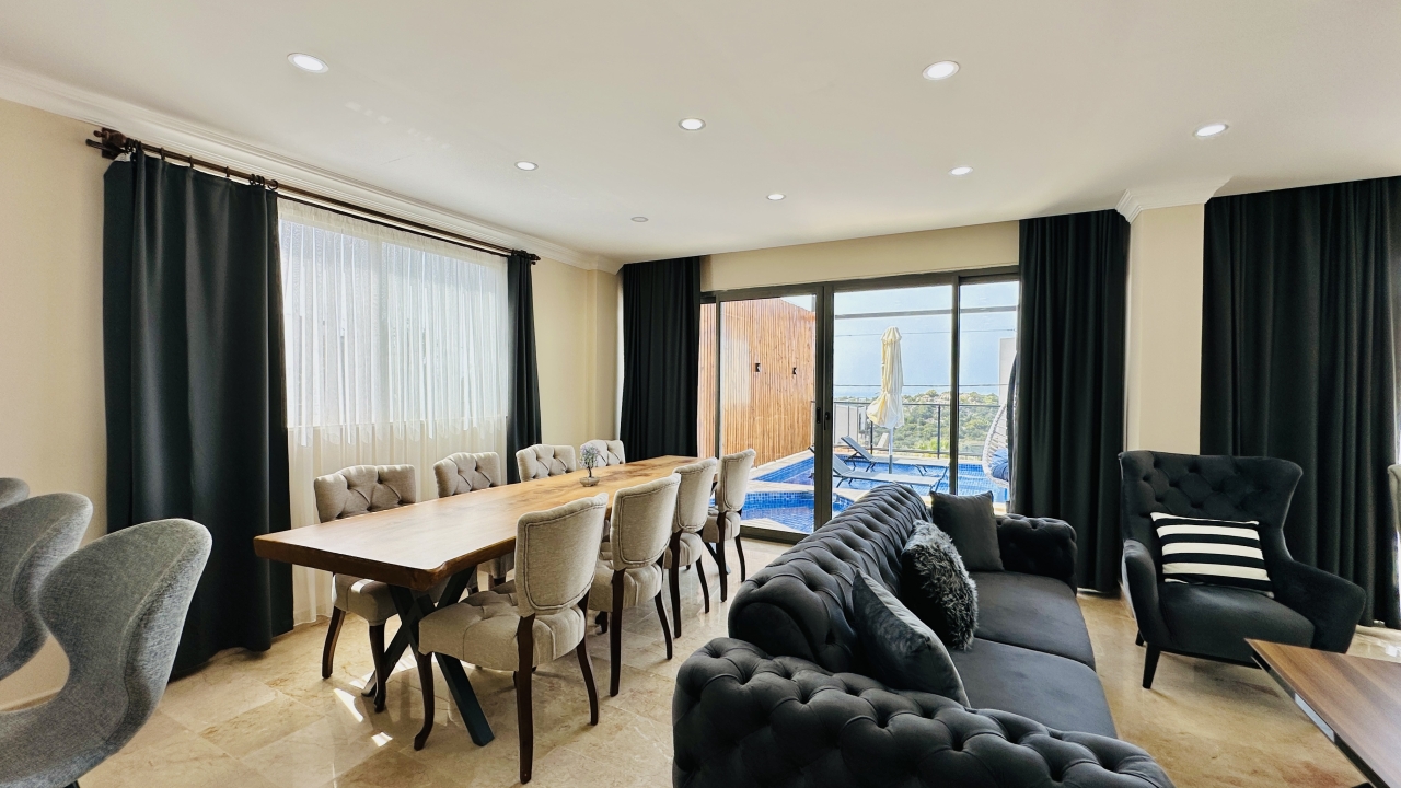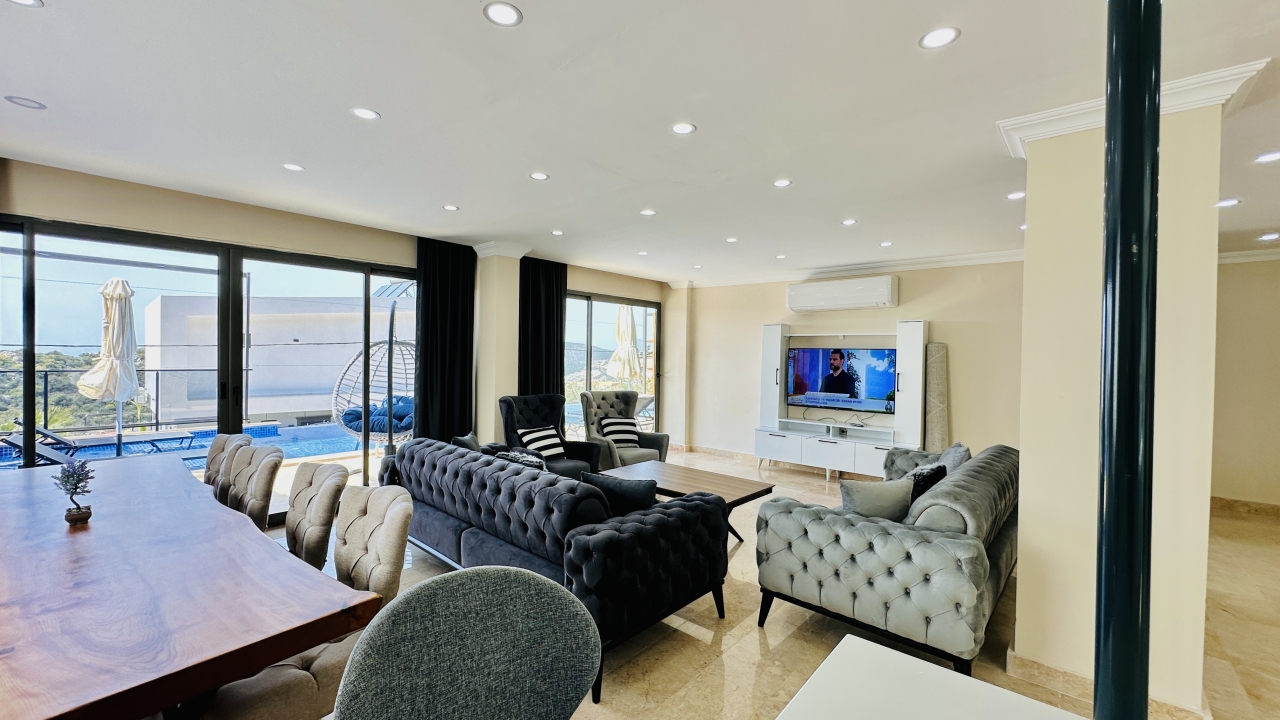 Villanın iç mekânı geniş ve ferah yaşam alanlarına sahiptir. Salon bölümünde konforlu oturma grupları, tatil sırasında da rahatça vakit geçirebileceğiniz şekilde düzenlenmiştir. Modern mutfak, günlük ihtiyaçlara uygun tüm ekipmanlarla donatılmış olup kalabalık misafir gruplarının yemek hazırlıklarını kolaylaştırır. Villanın geniş iç hacmi, konaklama süresince konforlu bir yaşam alanı sunmayı hedefler.
