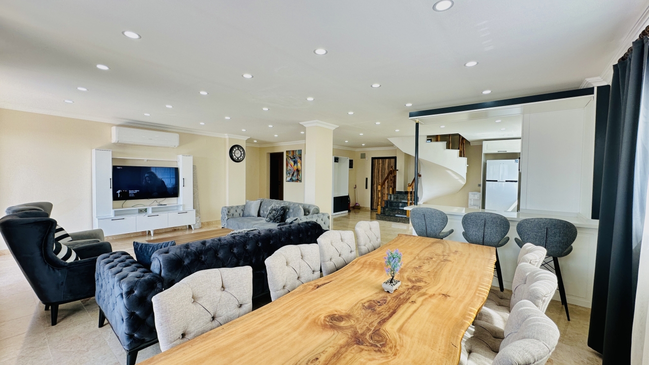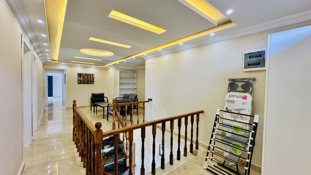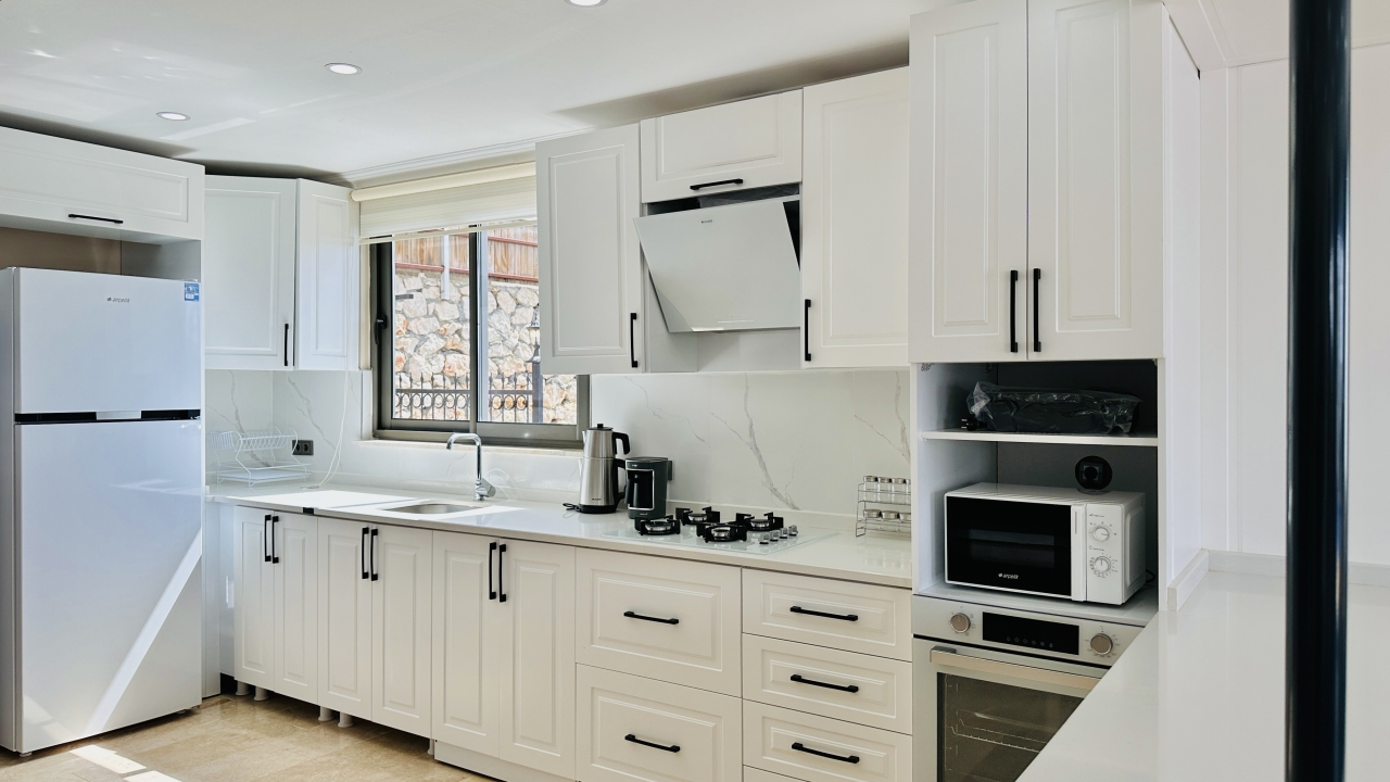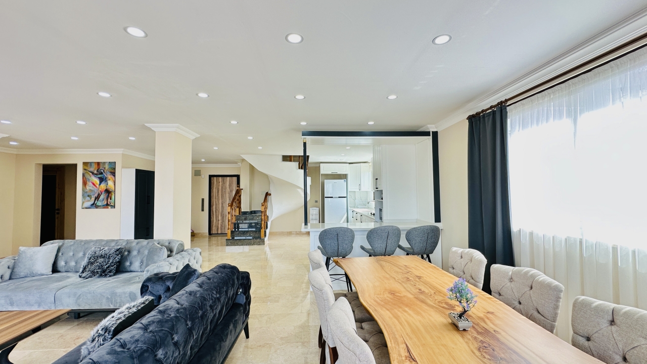 Villanın iç mekânı geniş ve ferah yaşam alanlarına sahiptir. Salon bölümünde konforlu oturma grupları, tatil sırasında da rahatça vakit geçirebileceğiniz şekilde düzenlenmiştir. Modern mutfak, günlük ihtiyaçlara uygun tüm ekipmanlarla donatılmış olup kalabalık misafir gruplarının yemek hazırlıklarını kolaylaştırır. Villanın geniş iç hacmi, konaklama süresince konforlu bir yaşam alanı sunmayı hedefler.