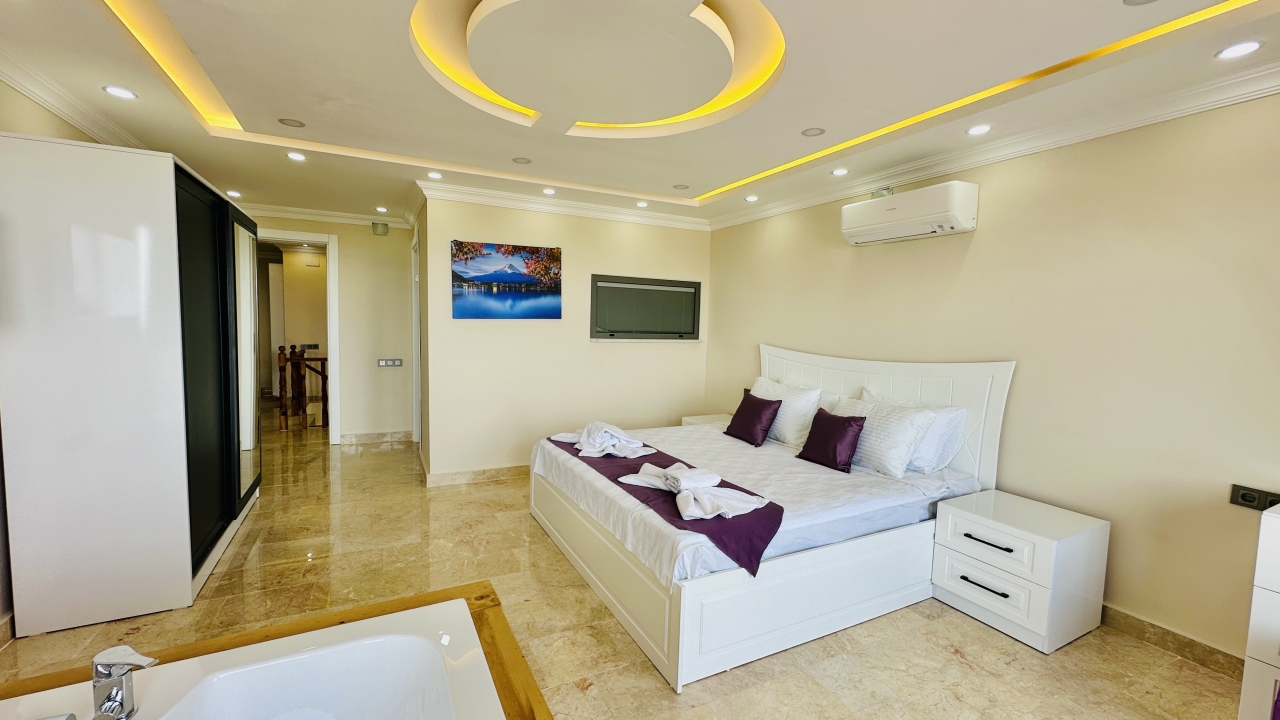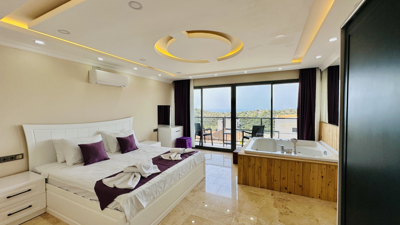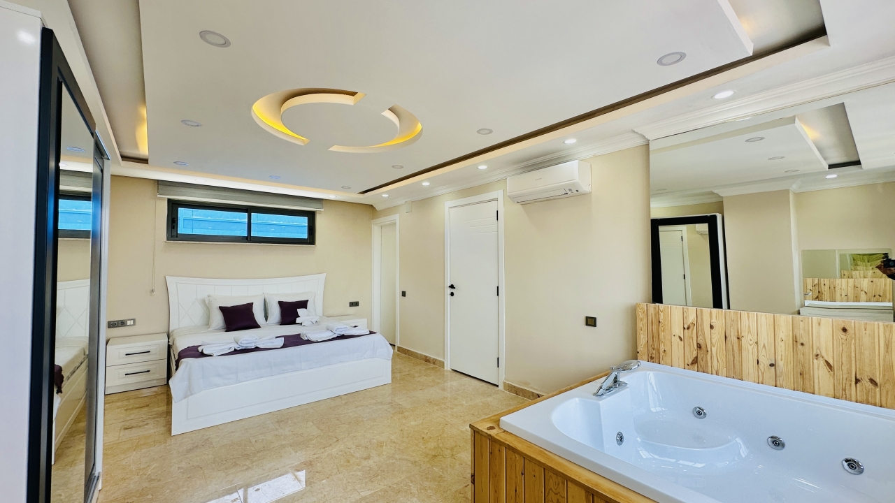 Beş yatak odasının dört tanesinde çift kişilik yatak, bir tanesinde ise iki adet çift kişilik yatak bulunmaktadır. Her odanın ferah yapısı ve modern dekorasyonu, misafirlerin konforunu artırır. Villada bulunan çift jakuzi, tatilinize keyif ve rahatlama katan ayrıcalıklı bir özellik olarak öne çıkar.