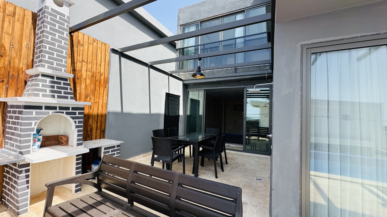 şemsiye, yemek masası, barbekü oturma alanı ve salıncak bulunmaktadır.