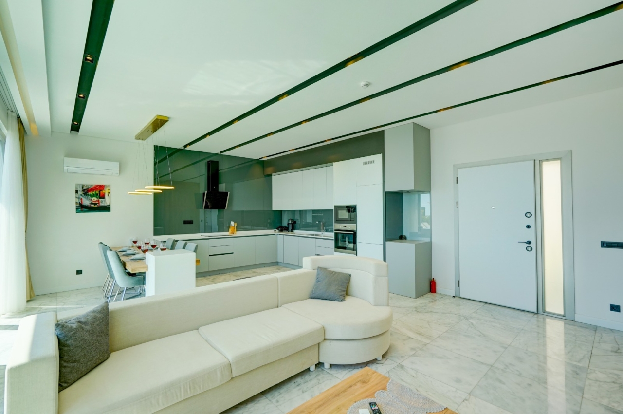 Villanın salon ve mutfak alanı, modern ve şık dekorasyon anlayışına uygun şekilde düzenlenmiştir. Açık plan yerleşim, oturma alanı ile yemek bölümünü bir araya getirerek ortak yaşam alanında rahat bir akış sağlar. Salon, gün içinde birlikte vakit geçirmek için konforlu bir ortam sunarken, mutfak alanı tatil boyunca temel ihtiyaçları karşılayacak şekilde planlanmıştır. İç mekânda tercih edilen sade ama özenli detaylar, villanın lüks algısını destekler.