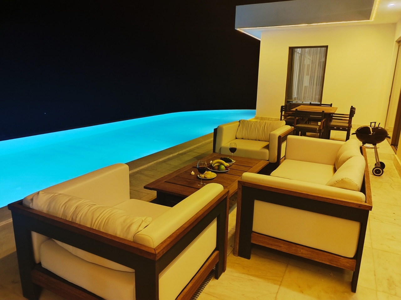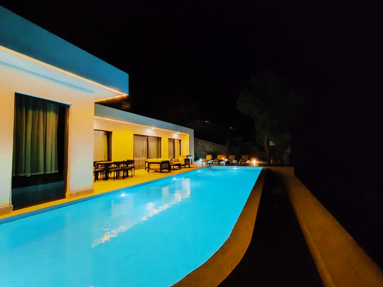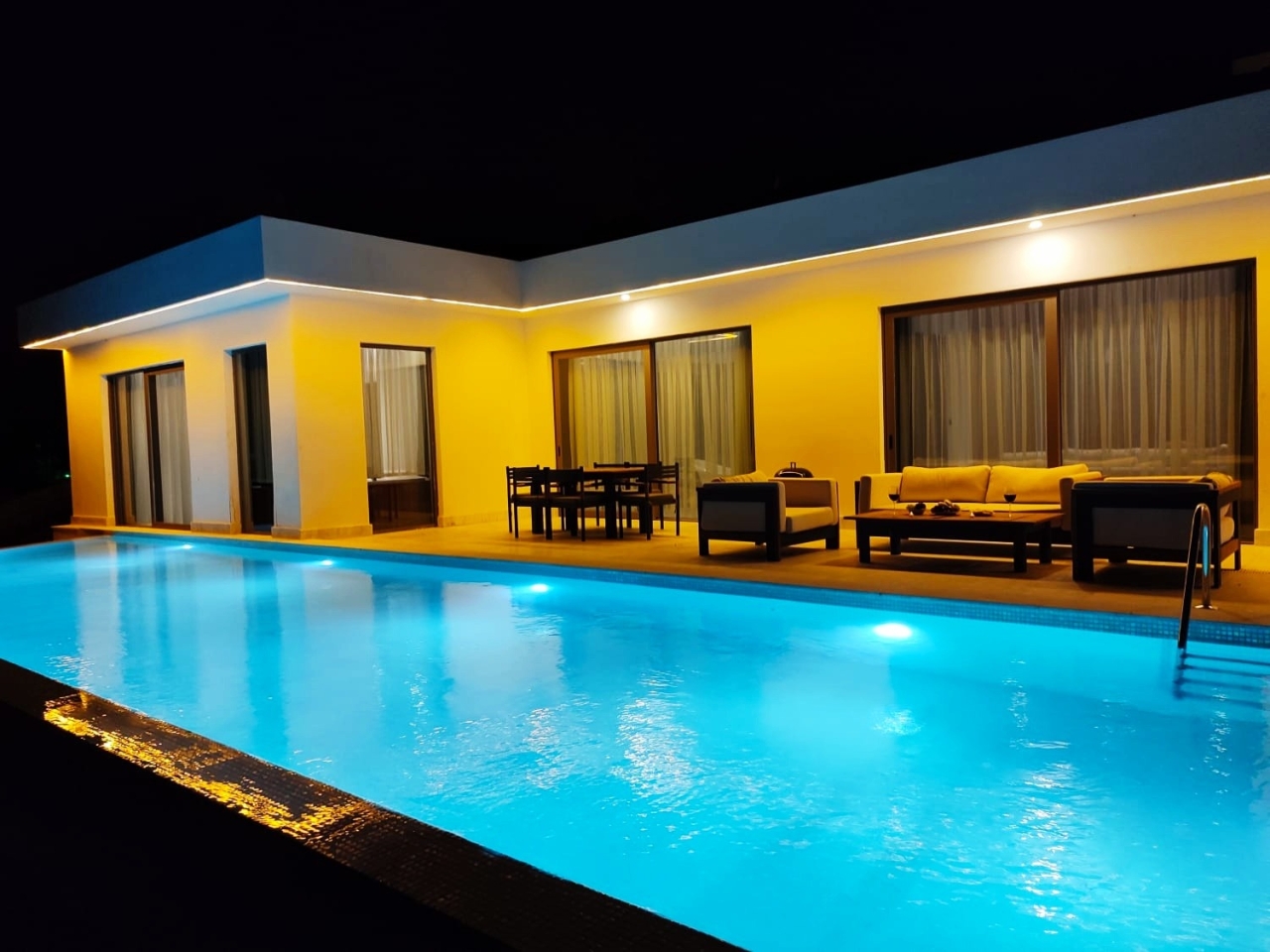 Villanın dış alanında yer alan özel yüzme havuzu, korunaklı yapısı sayesinde daha rahat bir kullanım imkânı sunar. Havuz çevresi, doğa manzarası eşliğinde gün boyunca vakit geçirmek isteyen misafirler için keyifli bir alan oluşturur. Açık alan düzeni, villada geçirilen zamanı daha sakin ve özel hâle getirir.