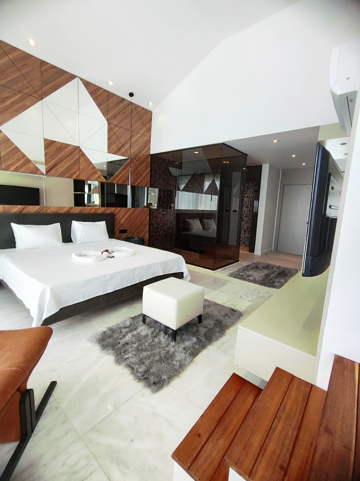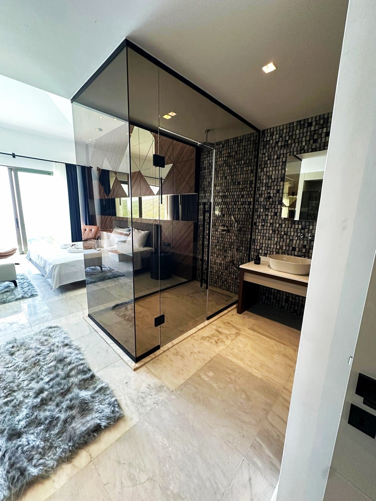 Villa Sun 10’da bulunan 2 yatak odasının birinde jakuzi, diğerinde ise küvet yer alır. Bu düzen, konaklama süresince farklı kullanım tercihlerine hitap eden bir konfor sunar. Yatak odalarının yerleşimi, hem mahremiyet hem de kullanım kolaylığı sağlayacak şekilde dengeli olarak planlanmıştır.