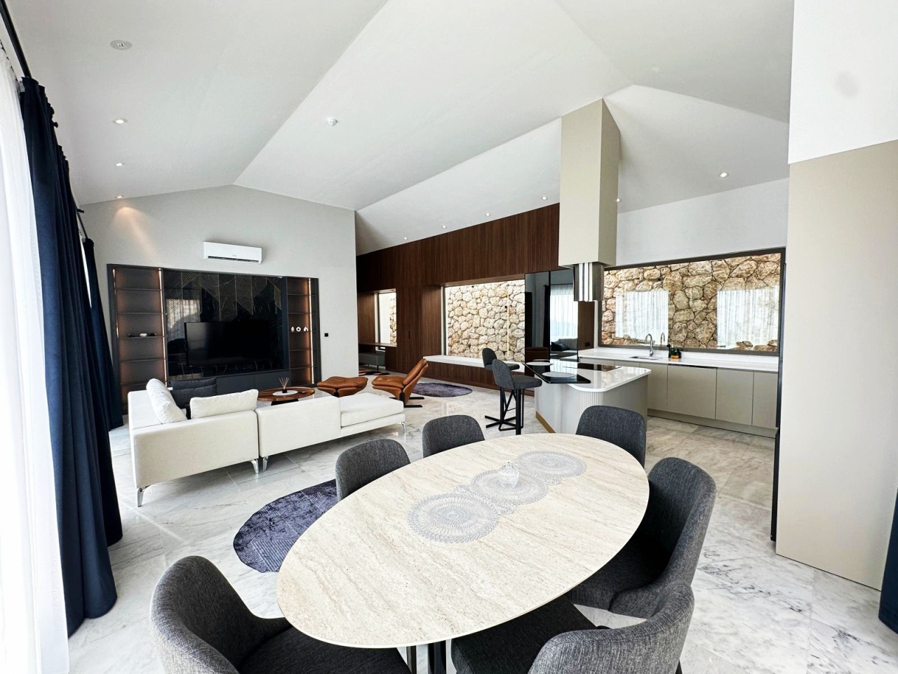 Villanın salon ve mutfak alanı, modern ve şık dekorasyon anlayışına uygun şekilde düzenlenmiştir. Açık plan yerleşim, oturma alanı ile yemek bölümünü bir araya getirerek ortak yaşam alanında rahat bir akış sağlar. Salon, gün içinde birlikte vakit geçirmek için konforlu bir ortam sunarken, mutfak alanı tatil boyunca temel ihtiyaçları karşılayacak şekilde planlanmıştır. İç mekânda tercih edilen sade ama özenli detaylar, villanın genel lüks algısını destekler.
